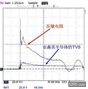 圖3:TVS元件與壓敏電阻在8kVIEC61000-4-2應力沖擊測試下的輸出波形對比