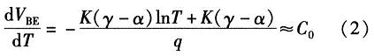 如果忽略由溫度變化引起lnT項變化對式(2)的影響,dVBE/dT可近似等于常數C0。常溫下C0約為-2 mV/K。為了簡化計算,則PN結關于溫度的變化方程可近似線性為