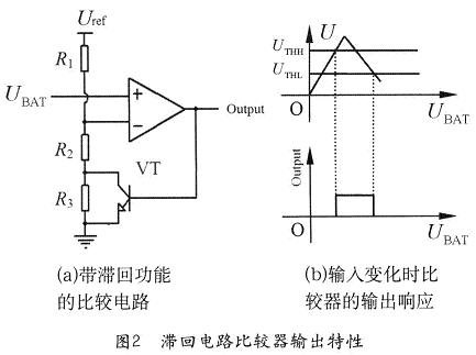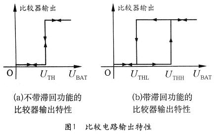 但如果在比較電路中設(shè)置兩個(gè)門限電壓:UTHH和UTHL(UTHH>UTHL),則可以形成一個(gè)滯回區(qū),如圖1(b)所示。當(dāng)電池電壓從低升高至UTHH時(shí),比較器輸出高電平,打開(kāi)電子開(kāi)關(guān),給負(fù)載供電;當(dāng)電池電壓降低至UTHL時(shí),比較器輸出低電平,斷開(kāi)負(fù)載。這個(gè)時(shí)候電池端電壓雖然會(huì)迅速升高至UTHL以上,但由于達(dá)不到UTHH,所以,比較器仍然輸出低電平,負(fù)載仍被斷開(kāi),直到電池被充電后電壓升高至UTHH以上才能再次接通負(fù)載。這樣就避免了電路的振蕩,保護(hù)了負(fù)載和電池。