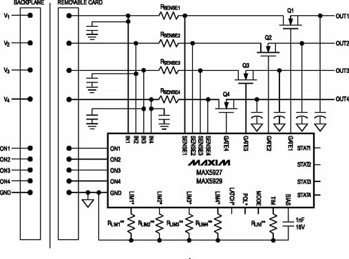 Maxim公司推出了一系列電源熱插拔控制器,適應于各種背板電源的要求。MAX5927/5929是針對低壓電源系統的+1V到13.2V的四通道熱插拔控制器。在電路板熱插拔時,MAX5927/5929控制輸出電壓緩慢升高,同時限制輸入電流小于預設值,避免瞬態大電流沖擊,保證了系統的安全性和穩定性。圖1是典型應用電路圖,圖2是熱插拔時的啟動電壓、電流波形??梢钥闯?,MOSFET的柵極電壓受MAX5927/5929的控制,按照固定斜率上升,逐漸打開MOSFET,輸出到電路板的電壓也基本同步地按斜率上升,瞬態電流則始終被控制在門限值以內,避免了大的沖擊電流的出現。啟動時間和電流限值都可以簡單地通過一個外部電阻來設定,為設計工程師提供了極大的靈活性。