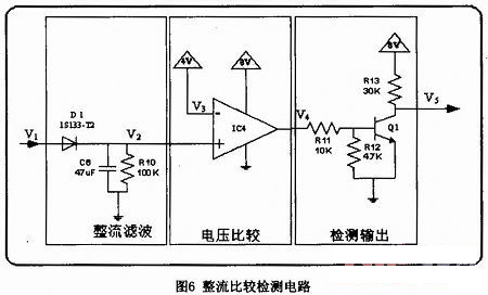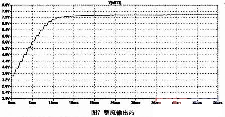整流電路由D1、R10、C6組成(參見圖6)。它起到了平緩放大后信號(hào)的變化幅度,使它接近直流信號(hào)的作用。當(dāng)V1和V2之間的壓差大于二極管的導(dǎo)通電壓時(shí),二極管導(dǎo)通,對(duì)電容C6充電(同時(shí)一部分電流流過R10及比較器的輸入阻抗);當(dāng)V1和V2的壓差小于二極管的導(dǎo)通電壓時(shí),二極管截止,電容上的電荷通過R10(及比較器的輸入阻抗)放電。當(dāng)放電到V1和V2的壓差再次大于二極管的導(dǎo)通電壓時(shí),二極管導(dǎo)通,又開始充電的過程。該電路就反復(fù)地進(jìn)行這樣的充放電過程。由于R10、C6值都很大,放電的速度很慢,電容電壓接近直流。由微分方程可得,放電時(shí)間T=RC1n(Vo/Vt),Vo為放電初始電壓,Vt為放電后的電壓,R為放電通路的電阻值,C為放電的電容值??梢奟,C越大,放電時(shí)間越長(zhǎng),即電壓越不容易變化。圖7為整流濾波的仿真輸出。