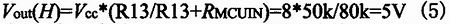 當(dāng)比較器輸出低電平,Q1截止,8V通過R13與微控芯片(MCU)相應(yīng)端口的輸入阻抗RMCUIN進(jìn)行分壓,通常MCU相應(yīng)端口的輸入阻抗RMCUIN≈ 50kΩ,則輸出高電平可以由如下計(jì)算得到:
