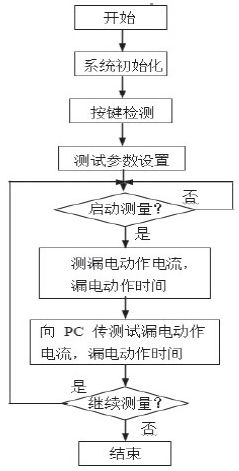 主程序是漏電動作特性檢測試驗的核心程序,在測試系統開始工作后,程序保持在主程序中循環運行,根據不同需要對其它功能子程序進行調用,調用完畢后,程序返回主程序繼續進行循環。主程序流程圖如圖5所示。