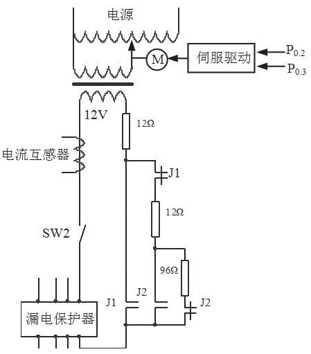 測試電流產生和調節模塊如圖2所示。測試電流的產生是將50Hz、220V的正弦交流電經過220:12的降壓變壓器和電動調壓器,輸出0~12V的正弦交流電,再通過回路電阻,產生需要的測試電流。測試電流的產生分為3檔,以滿足不同的測量范圍。繼電器J1吸合,可產生0~1000mA的測試電流;繼電器J2吸合,可產生0~500mA的測試電流;繼電器J1、J2都不吸合,可產生0~100mA的測試電流。每一檔測試電流的調節通過LPC2132控制電動調壓器實現。為了使測試電流能均勻地變化,電動調壓器采用了交流伺服控制。在測試過程中,LPC2132對采集到的實時回路中的測試電流值與設定值比較,并計算得到控制量,控制伺服電動機轉動,帶動電動調壓器的電刷在副邊上穩定地滑動,使副邊電壓變化,從而改變回路中的電流。LPC2132的P0.2腳輸出脈沖信號控制伺服電動機的運動速度,P0.3腳輸出高或低的電平信號,控制伺服電動機轉動的方向。