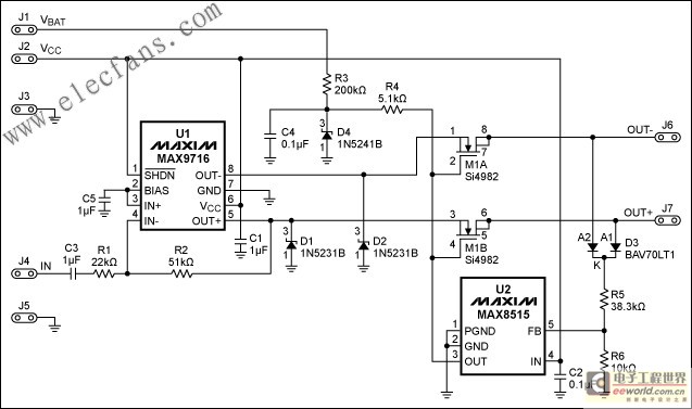 一個雙N溝道MOSFET斷開在回答有關任何輸出高電壓狀態(tài)下從線束放大器輸出。 MOSFET管(M1A及數M1B)一般上,用自己的驅動11V的齊納二極管的(4點)及其約11V的偏置元件。這種雙二極管D3提供了一個在每個輸出直流電壓二極管或連接,從而產生電壓,控制分流穩(wěn)壓器U2樂隊(MAX8515)輸出。所示的電路U1的保護,一個1.4W功率AB類放大器(MAX9716)以上(聲音警告和汽車的司機的跡象)中提到的應用場合。