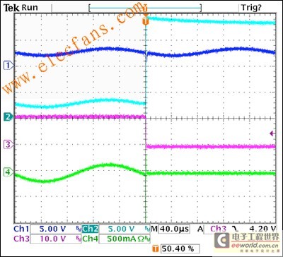 圖2的波形代表一個工作電路。放大器的輸出之一(上跟蹤,深藍色)是一個1kHz正弦波直流偏壓為2.5V。第二次跟蹤(青色)是線束上看到的信號。這也從一開始就是在2.5V直流偏置一個1kHz正弦波,但200μs是一個18V電源短路。第三次跟蹤(洋紅色)是分流穩(wěn)壓器輸出,最初在11V的偏見,但拉回應過壓條件地面。第四次跟蹤(綠色)線束的電流。最初是一個正弦波,電流下降到零這個回應過壓條件。