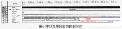 在本系統(tǒng)中,我們基于直接數(shù)字頻率合成(DDS)技術(shù)進(jìn)行信號(hào)產(chǎn)生。DDS的實(shí)現(xiàn),使用芯片AD9951。AD9951是一個(gè)可控的頻率合成芯片,具有32位頻率轉(zhuǎn)換字,最大合成頻率為160MHz。系統(tǒng)中采用兩塊AD9951,分別產(chǎn)生主振信號(hào)和本振信號(hào)。FPGA通過(guò)該芯片的控制端口,對(duì)其產(chǎn)生的信號(hào)頻率進(jìn)行控制。其控制時(shí)序如圖4所示。
