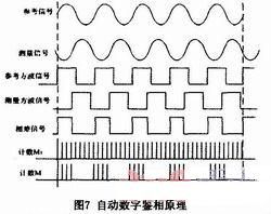 由于測(cè)量信號(hào)頻率較高,直接對(duì)其進(jìn)行鑒相難以達(dá)到良好的鑒相精度,因而在系統(tǒng)中采用混頻的方法進(jìn)行差頻鑒相。在差頻鑒相中,參考信號(hào)和測(cè)量信號(hào)同時(shí)與本振信號(hào)進(jìn)行混頻,濾除混頻后高頻分量,得到混頻后低頻參考信號(hào)和混頻后低頻測(cè)量信號(hào)。混頻降低了信號(hào)頻率,但保持相位差不變,便于鑒相操作。相位差的檢測(cè)使用自動(dòng)數(shù)字鑒相法。其原理如圖7所示。參考信號(hào)和測(cè)量信號(hào)通過(guò)過(guò)零比較,得到參考方波信號(hào)和測(cè)量方波信號(hào)。比較兩方波信號(hào),得到兩者之間的相位差信號(hào),然后使用高頻計(jì)數(shù)脈沖對(duì)相位差信號(hào),然后使用高頻計(jì)數(shù)脈沖對(duì)相位差信號(hào)進(jìn)行計(jì)數(shù)。設(shè)參考信號(hào)和測(cè)量信號(hào)的周期為f,高頻計(jì)數(shù)脈沖的頻率為fc,一個(gè)周期內(nèi)的計(jì)數(shù)值為M,則相位差為:△φ=2πMf /fc。為了減小偶然誤差,提高鑒相精度,可以對(duì)多個(gè)周期計(jì)數(shù)求平均。設(shè)N個(gè)周期的計(jì)數(shù)值為M'',則△φ=2πM''f/Nfc。