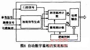 混頻電路的實(shí)現(xiàn)基于混頻器AD831。使用兩片AD831,分別用于參考信號(hào)與本振信號(hào)混頻及測(cè)量信號(hào)與本振信號(hào)混頻。混頻后使用芯片MAX274進(jìn)行帶通濾波,得到混頻后的低頻正弦信號(hào)。然后通過(guò)基于MAX912的過(guò)零比較電路將正弦信號(hào)轉(zhuǎn)換為同相位差的方波信號(hào),輸入到FPGA中進(jìn)行鑒相。在FPGA中,利用多周期自動(dòng)數(shù)字鑒相法,對(duì)相位差進(jìn)行檢測(cè)。其實(shí)現(xiàn)框圖如圖8所示。