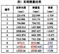 在實(shí)際測(cè)量中,利用組合測(cè)尺頻率先后進(jìn)行兩次測(cè)量。第一次取主振信號(hào)頻率為52MHz,本振信號(hào)頻率為51.99MHz;第二次取主振信號(hào)頻率為51MHz,本振信號(hào)頻率為50.99MHz。對(duì)應(yīng)于混頻后信號(hào)頻率為10kHz。FPGA中鑒相高速計(jì)數(shù)脈沖頻率為50MHz。基于以上參數(shù),對(duì)多段光纖進(jìn)行測(cè)量。兩次測(cè)量的結(jié)果進(jìn)行分析比較,可得到測(cè)量值。被測(cè)光纖的實(shí)際光程已由精密反射儀通過(guò)光學(xué)方法進(jìn)行標(biāo)定。測(cè)量結(jié)果如表1所示。