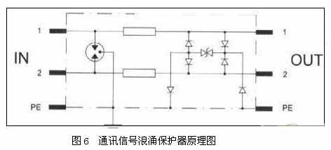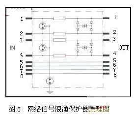 BAx系列信號浪涌保護器是專為通過雙絞線進行信號傳輸?shù)脑O(shè)備而設(shè)計,以保護其避免遭受感應過電壓和操作過電壓的損害。該浪涌保護器輸入、輸出采用RJ45公/母于接頭串聯(lián)保護。網(wǎng)絡(luò)信號浪涌保護器原理圖見圖5所示。