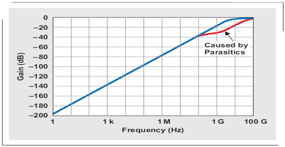 一次電路仿真證實了 RC 網絡為一個一階高通濾波器,其 C′1 和 R′1 為主要組件,頻率高達 100 MHz(參見圖 5 中藍色曲線)。超出這一頻率以后,寄生組件 C′2 和R′2生效,從而引起稍稍偏離于線性的斜率。因此,頻率達到 100 MHz 以后,增益響應可以表示為 VID/vn 的比: