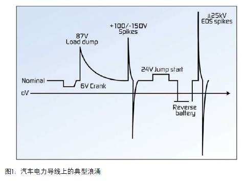 圖1中顯示了最常見的電源軌瞬態(tài)。從嚴重的低電平-高能量到高電平-低能量的瞬態(tài)變化。特別關(guān)注的是,這些電源系統(tǒng)上得瞬態(tài)變化應(yīng)滿足ISO7637-2和ISO10605標(biāo)準(zhǔn)。