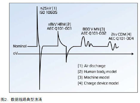 圖2顯示數(shù)據(jù)線路上產(chǎn)生的瞬態(tài)主要是ESD浪涌。盡管此類浪涌為低能量,但是會產(chǎn)生強大的電磁場。