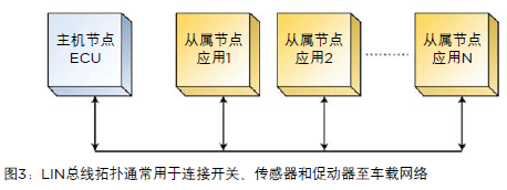 LIN總線拓撲利用一臺獨立主機或ECU(電子控制單元)以及多個節(jié)點,如圖3所示。連接應(yīng)用模塊至車載網(wǎng)絡(luò)使其可進行診斷和提供服務(wù)。