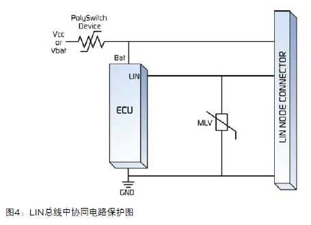 圖4為協(xié)同的電路保護圖,顯示出一個設(shè)置在功率輸入的可復(fù)位PolySwitch器件如何在電源輸入端保護ECU和LIN節(jié)點連接器免受過電流情況的損傷,以及一個MLV(多層電壓敏電阻器)如何為車載網(wǎng)絡(luò)應(yīng)用提供所需的高電流處理和能量吸收的過電壓保護。