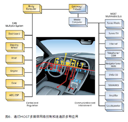 實際上,MOST是一個節(jié)點網(wǎng)絡(luò),用于傳輸車載多媒體和信息娛樂系統(tǒng)中出現(xiàn)的各種不同信號和數(shù)據(jù)流。MOST標(biāo)準(zhǔn)支持多種物理接口,如圖6所示。MOST標(biāo)準(zhǔn)中,這些應(yīng)用可參考功能塊。每個功能塊包括幾種功能(如一個CD播放器可以包括播放、停止、彈出和播放時間等功能)。