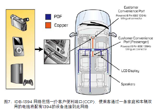 IDB-1394車載結(jié)構(gòu)可分為內(nèi)置網(wǎng)絡(luò)和客戶便利端口,簡稱CCP,如圖7所示。該標(biāo)準(zhǔn)顯示了一種類似于現(xiàn)有MOST標(biāo)準(zhǔn)的一種內(nèi)置塑料光纖(POF)車載網(wǎng)絡(luò)。然后,該網(wǎng)絡(luò)更加穩(wěn)固且更易使用。多種電子元件可以連接到此網(wǎng)絡(luò),如DVD播放器、視屏顯示器、導(dǎo)航系統(tǒng)、無線電主機以及通訊設(shè)備。