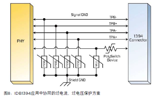 CCP端口包括一個車載等級1394b的物理層和連接器,允許用戶將便攜式設(shè)備連接到車輛,通過IDB-1394接口獲取音頻和視頻服務(wù)。CCP端口采用標(biāo)準(zhǔn)連接器,專為該設(shè)備供電而設(shè)計。其供電特點無需額外電池或單獨電源線,讓客戶無需為插入的設(shè)備是否已經(jīng)通電而擔(dān)憂。IDB-1394為高速多媒體應(yīng)用而設(shè)計,總線速度高達800Mbps且要求通電端口具有可復(fù)位過電流保護。如圖8所示,PolySwitch設(shè)備可用于在出現(xiàn)故障時限制危險高電流。MLV可安裝到供電總線上避免ESD浪涌和過電壓瞬態(tài)所產(chǎn)生的損害。低電容PESD設(shè)備或PESD陣列也可安裝在數(shù)據(jù)線路上幫助提供ESD保護。