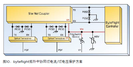 byteflight協(xié)議是一個車載數(shù)據(jù)總線,為提供車載元件之間進行非常安全且容錯的電子通訊手段而開發(fā)。byteflight在總線、星形或集群配置中通過2線或3線塑料光纖(POF)達到10Mbps以上的速度。該系統(tǒng)結(jié)構(gòu)中使用POF使其功能能夠在數(shù)據(jù)方面達到電氣上的獨立。然而,節(jié)點仍然從車載供電總線處獲得電流,而且會受到電磁干擾的影響。構(gòu)成該網(wǎng)絡(luò)的元件,如微處理器、byteflight控制器和光收發(fā)器,容易因供電尖峰和反向電壓而受到損傷。集成電路(ICs)或許包括ESD保護,但是通常限制在2kV以下。如圖10所示,PolySwitch設(shè)備和MLV可以保護這些模塊不受高能量過電壓和過電流瞬態(tài)的影響而產(chǎn)生損傷。