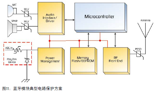藍牙標(biāo)準(zhǔn)雖然最初并非為車載環(huán)境而設(shè)計,但已經(jīng)為車輛和其系統(tǒng)之間進行溝通的移動電子設(shè)備創(chuàng)造了新的市場前景,如手機、MP3播放器和導(dǎo)航設(shè)備。保護暴露在外的通訊界面不受因天線和儀器無線(RF)界面所產(chǎn)生的ESD和其他電壓浪涌的影響是一個相當(dāng)重要的設(shè)計問題。圖2顯示了一個PolyZen集成過電流/過電壓設(shè)備如何幫助保護藍牙模塊的功率輸入。MOV或表面安裝的MLV也可用于避免車載麥克風(fēng)和擴音器界面上出現(xiàn)電壓瞬態(tài)。PESD設(shè)備可以用于避免電線出現(xiàn)ESD浪涌。