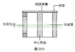 失效保護(hù)機(jī)構(gòu)是焊接在中心電極上帶塑料薄片的短路簧片。在正常的工作條件下,塑料薄片與兩個(gè)外側(cè)電極隔離,如圖G13。當(dāng)長(zhǎng)時(shí)間放電使氣體放電管溫度達(dá)到塑料薄片的熔點(diǎn)時(shí),塑料薄片就會(huì)被軟化,促使短路彈片被激活,并與兩個(gè)外側(cè)電極搭接。這個(gè)過程導(dǎo)致三個(gè)電極之間永久短路,建立起一條低阻抗路徑,將故障電流引到地面,而不會(huì)產(chǎn)生顯著的熱量。