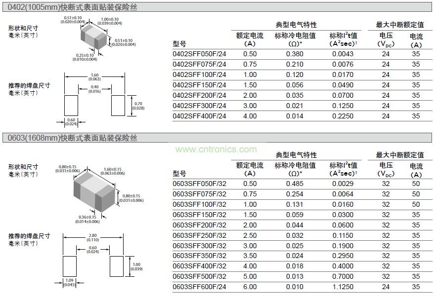 表 FF2 典型的電氣特性、尺寸和推薦焊盤