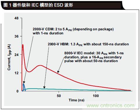 2、另一個差異存在于電壓尖峰上升時間。HBM 的規(guī)定上升時間為 25ns。IEC 模型脈沖上升時間小于 1ns,其在最初3ns 消耗掉大部分能量。如果 HBM 額定的器件需 25ns 來做出響應,則在其保護電路激活以前器件就已被損壞。
