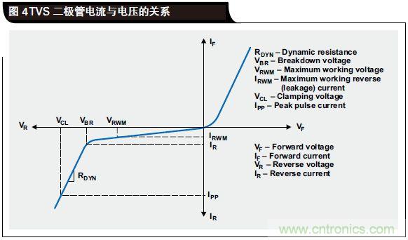 圖 4 顯示了 TVS 二極管電流與電壓特性的對比情況。盡管 TVS 是一種簡單的結構,但是在系統(tǒng)級 ESD 保護設計過程中仍然需要注意幾個重要的參數。這些參數包括擊穿電壓 VBR、動態(tài)電阻 RDYN、鉗位電壓 VCL 和電容。