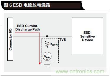 ESD 是一種極速事件,也就是幾納秒的事情。在如此短的時間內,TVS 傳導接地通路不會立即建立起來,并且在通路中存在一定的電阻。這種電阻被稱作動態(tài)電阻(RDYN),如圖 5 所示。