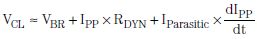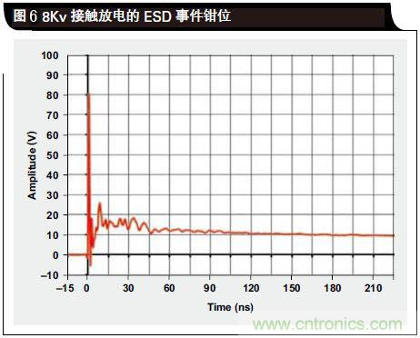 由于ESD是一種極速瞬態(tài)事件,I/O路線的電壓不能立即得到鉗制。如圖6所示,根據IEC 61000-4-2標準,數千伏電壓被鉗制為數十伏。如方程式1所示,RDYN越小,鉗位性能也就越好:其中,IPP為ESD事件期間的峰值脈沖電流,而Iparasitic為通過TVS接地來自連接器的線路寄生電感。