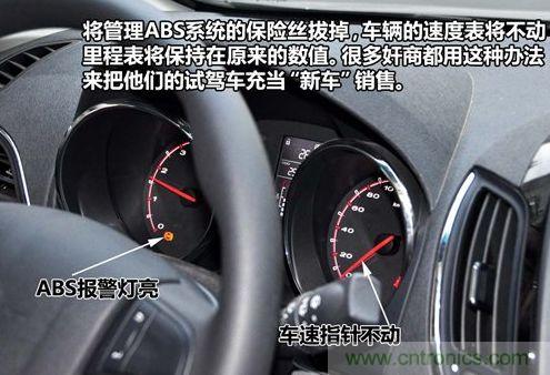 當(dāng)您新購買車的時(shí)候發(fā)現(xiàn)車輛的里程表和車速表不工作時(shí)要注意了,因?yàn)楹芸赡苁羌樯贪涯囕v管理ABS泵的保險(xiǎn)絲給拆下來了,這樣車輛還能正常開但里程數(shù)不增加,而這也是很多奸商翻新試駕車后當(dāng)新車賣的常用手段。
