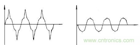 圖4中在開啟或關閉帶有感性, 容性的負載電路時, 直流波形出現(xiàn)開關尖脈沖, 壓敏電阻將吸收這種反電動勢, 有效地保護開關電路、變電壓。