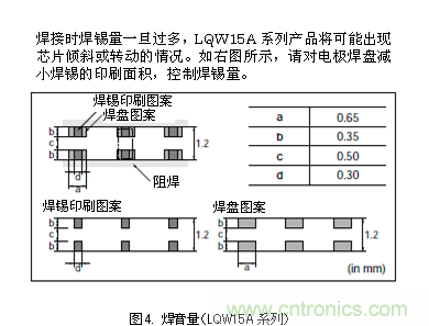 例如,LQW15A系列為獲得最適當?shù)暮稿a量,本公司提供了焊錫厚度和焊盤尺寸對應的推薦焊錫量。(圖4)
