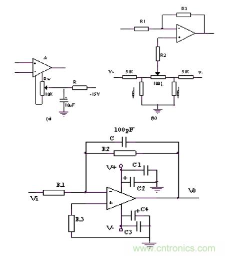 另外,防止通過電源內阻造成低頻振蕩或高頻振蕩的措施是在集成運放的正、負供電電源的輸入端對地一定要分別加入一電解電容(10mF)和一高頻濾波電容(0.01mF~0.1mF)。如圖3.2.3所示。