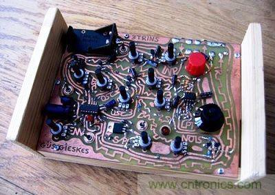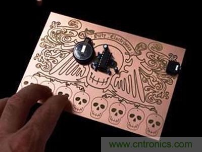 接著是跟前面的街頭涂鴉風格完全不同的另一款迷你合成器電路板;電路板上并列的那一排骷髏是合成器的鍵盤,振蕩器(oscillator)的間距是由皮膚接觸的電平來控制。事實上,玩這個小東西的秘訣是,在開始彈奏之前先舔一舔(?!)指尖…