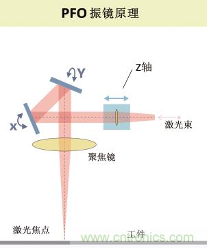 除了激光拼焊,激光飛行焊也已經被廣泛應用于汽車車身及其他零部件的焊接。激光飛行焊是將振鏡焊接頭與機器人的運動結合起來,實現高效靈活的激光焊接。振鏡(PFO)及飛行焊的原理見圖4、5、6。其中PFO可以通過兩片鏡片的旋轉,實現激光焦點在工件上的快速靈活移動和定位,可以大大提供激光焊接時的動態性能,更加高效。而機器人則可以擴展焊接范圍,以實現更大零件的焊接。兩者的結合,則可以實現優勢互補,達到高效、靈活、低成本的激光焊接。