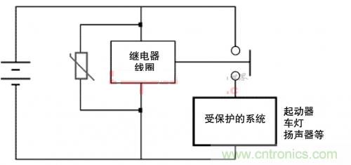 圖2.壓敏電阻為直流電壓較低的汽車應(yīng)用提供了高浪涌電流電路保
