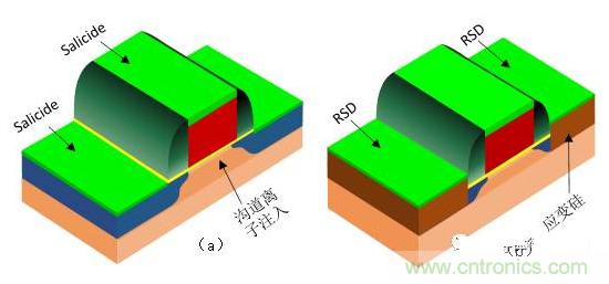 隨著MOS器件的特征尺寸不斷縮小到90nm及以下時(shí),短溝道效應(yīng)中的器件亞閾值電流成為妨礙工藝進(jìn)一步發(fā)展的主要因素,盡管提高溝道摻雜濃度可以在一定程度上抑制短溝道效應(yīng),然而高摻雜的溝道會(huì)增大庫倫散射,使載流子遷移率下降,導(dǎo)致器件的速度降低,所以僅僅依靠縮小MOS器件的幾何尺寸已經(jīng)不能滿足器件性能的提高,需要一些額外的工藝技術(shù)來提高器件的電學(xué)性能,例如應(yīng)變硅技術(shù)。應(yīng)變硅技術(shù)是通過外延生長在源漏區(qū)嵌入應(yīng)變材料使溝道發(fā)生應(yīng)變,從而提高載流子遷移率,最終提高器件的速度。例如NMOS的應(yīng)變材料是SiC,PMOS的應(yīng)變材料是SiGe。另外,隨著源漏的結(jié)深的短減小,源漏擴(kuò)散區(qū)的厚度已經(jīng)不能滿足形成Salicide的最小厚度要求,必須利用新技術(shù)RSD(Raise Source and Drain)技術(shù)來增加源漏擴(kuò)散區(qū)的厚度。RSD技術(shù)是通過外延技術(shù)生長在源漏區(qū)嵌入應(yīng)變材料的同時(shí)提高源漏擴(kuò)散區(qū)的厚度。如圖1.15(b)所示,是采用應(yīng)變硅和RSD技術(shù)的MOS管結(jié)構(gòu)圖。