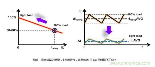 從中可知,要顯著提高其綜合效率,就必須最大限度地控制好較輕負荷時的功率損耗。利用混合磁路中不同磁材的特性,通過對其磁路長度、磁阻及繞線匝數等影響電感特性的諸要素進行優化調節,使之符合圖7所示的L-I直流電感偏置特性,從而可實現歐效改善與低成本設計的兼顧。