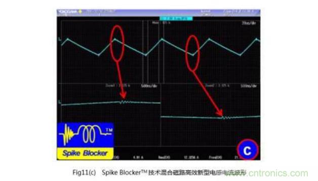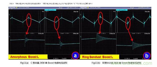 圖11(a)為目前廣為采用的C型非晶材料繞制的3 kW單Boost電感的額定功率時的典型工作電流波形。在Boost開通和關斷時,電感電流出現了比較嚴重的高頻振蕩,其振蕩頻率成分也比較豐富,約在20~30 MHz寬帶上;Fig11(b)為采用數只φ47的鐵硅鋁磁環繞制的3 kW單Boost電感的波形,同樣圖中顯示出10 MHz左右的高頻衰減振蕩;Fig11(C)則為采用了優化結構和相關設計工藝規范的Spike Blocker TM技術后,使用Hybrid Magnetics混合磁路設計的新型高效能電感的實測波形(這些測試均基于相同設備、相同輸入輸出電壓、功率、工作頻率條件),由此可見,關注電感的EMC設計工藝規范具有十分重要的意義。
