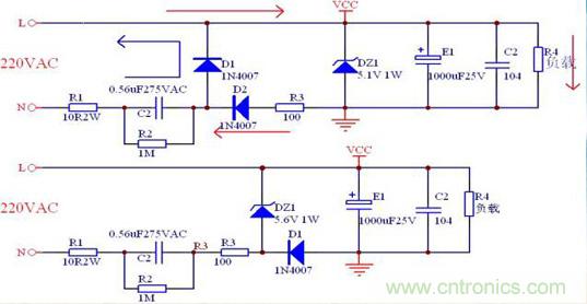 阻容降壓是一種利用電容在一定頻率的交流信號下產生的容抗來限制最大工作電流的電路。