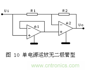 圖9要求R1=R2,R4可以用來調節(jié)增益,增益等于1+R4/R2;如果R4=0,增益等于1;缺點是正負半波的輸入阻抗不相等,要求輸入信號的內(nèi)阻要小,否則輸出波形不對稱。
