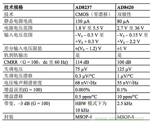 表 2 是對兩款儀表放大器進行了比較。都使用了最小和最大規格。有關更多詳情和最新信息,請參見產品數據手冊。