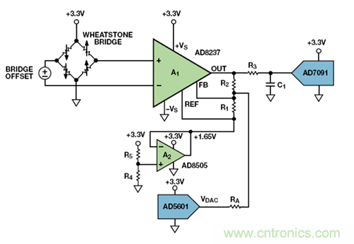 這個問題可通過圖 5 所示的電路來解決。電橋放大器A1是一個像AD8237 一樣的ICF儀表放大器。放大器A2,帶R4 和R5,將A1的零電平輸出設為中間電源。AD5601 8 位DAC對輸出進行調整,通過RA使電橋失調為 0。然后,放大器的輸出由AD7091微功耗 12 位ADC數字化。