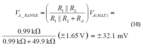 由于 DAC 可以擺動±1.65 V,因此,總失調調整范圍可通過由 RA以及 R1和 R2的并聯組合形成的分壓器給定,其計算方法如下: