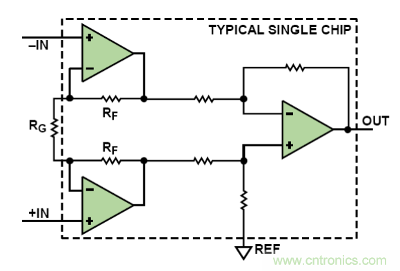 傳統的三運放儀表放大器架構(如圖 2 所示)有一個差分增益級,其后為一個減法器,用于移除共模電壓。增益施加于第一級,因此,失調放大的倍數與目標信號相同。因此,將其移除的唯一方法是在參考(REF)端施加反電壓。這種方法的主要不足在于,如果放大器的第一級已經飽和,則調節 REF 上的電壓并不能更正失調。克服這點不足的幾種方法包括: