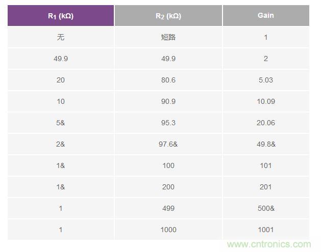 從等式(7),我們可以算出額定增益值為 103。如果設計師希望得到接近目標值 100 的增益值,最簡單的辦法是使 R2 的值降低 3%左右,至 97.6 k?,結果對 RA 的值的影響非常小。在新的條件下,額定增益為 100.6。