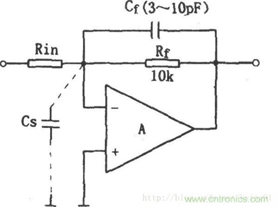 一般線性工作的放大器(即引入負(fù)反饋的放大電路)的輸入寄生電容Cs會影響電路的穩(wěn)定性,其補償措施見圖。放大器的輸入端一般存在約幾皮法的寄生電容Cs,這個電容包括運放的輸入電容和布線分布電容,它與反饋電阻Rf組成一個滯后網(wǎng)絡(luò),引起輸出電壓相位滯后,當(dāng)輸入信號的頻率很高時,Cs的旁路作用使放大器的高頻響應(yīng)變差,其頻帶的上限頻率約為: