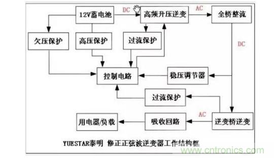 然后我們看一下整個過程的電路圖:12V直流→高頻升壓→220V直流→全橋整流→220V直流→逆變橋逆變→220V交流